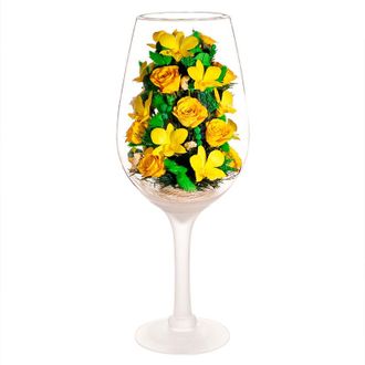 Полуметровый бокал, наполненный желтыми розами и орхидеями